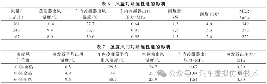 传统燃油车或采用电加热制热的汽车空调一般通过控制温度风门的角度来调节空调箱出风温度。表7展示了热泵除湿情况下温度风门对性能的影响。可以看出,当温度风门从100%全热调整到60%全热,系统的高低侧压力分别升高了0.87MPa和0.1MPa,使得车内冷凝器出风温度和蒸发器出风温度分别升高了29.2℃和9.1℃,然而空调箱的出风温度却几乎没有变化。这是由于在热泵系统中,车内冷凝器作为热源与作为冷源的蒸发器直接耦合,改变温度风门位置会改变流经车内冷凝器的风量从而影响系统的压力。因此,对于热泵系统而言,不能通过控制温度风门来控制出风温度,在除湿操作时应当使温度风门始终处于100%全热位置,从而达到节能高效的目的并使得系统具有最强的除湿能力。