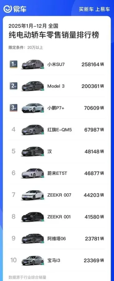 行业观察者小P从易车网发布的2025年国内20万元以上纯电轿车零售销量榜单获悉,小米SU7以258164辆的销量登顶年度销冠,展现出强劲的市场统治力。从数据维度看,该销量相当于日均销量超700辆,较第二名特斯拉Model 3的200361辆高出约5.7万辆,形成明显的销量优势。值得关注的是,榜单前十席位中本土品牌占据八席,外资品牌仅特斯拉与宝马两款车型跻身前十,市场份额被本土品牌大幅挤压。本文将基于销量数据与产品力分析,拆解小米SU7登顶逻辑及20万+纯电轿车市场的竞争格局,为行业研判与消费决策提供参考。
