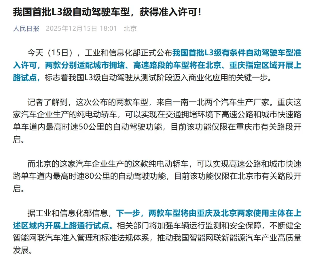 技术早已就绪,只等政策发令枪。不同于L2的“辅助”定位与L4的远期目标,L3因涉及驾驶责任的首次转移,一直是车企慎言的领域。直到2025年末,真正的转折点终于到来:工信部一纸公告,为首批L3有条件自动驾驶车型亮了绿灯,长期被压抑的L3量产之路就此开启: