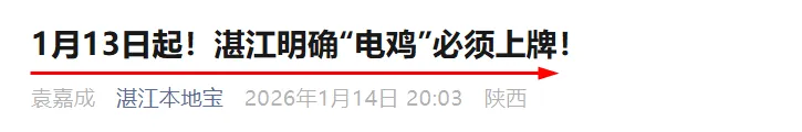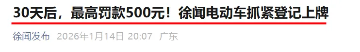 除了云浮市以外,广东湛江、雷州、徐闻等地也发布通告,内容仍然聚焦电动车登记上牌。还未登记的电动车要抓紧。湛江明确,未上牌的电动车上路,从1月13日公告发布之日起30日内,交管部门将以教育引导、督促上牌为主,30日后转为按规定处罚。徐闻的处罚更为严格,30日过渡期满后,未上牌的电动车最高罚款500元。