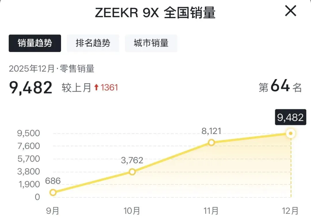 根据第三方平台公布的销量数据显示,极氪9X正在成为50万级高端SUV市场首选,成为自主品牌新标杆。数据显示,11月极氪9X销量8121台,首次超越问界M9的7804台;12月销量达到了9482台持续超越问界M9,而曾经细分市场引领者理想L9则仅仅卖出去了2732台,可以说以当前的销量数据来看极氪9X确实销量挺猛,当然了也得看极氪9X能否持续延续热销的状态!