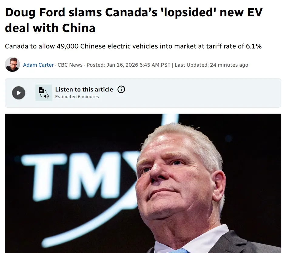 安大略省是加拿大汽车业的命脉。省长道格·福特激烈反对,警告称:这项严重失衡的协议,可能会把加拿大汽车制造商挡在美国市场之外。讽刺的是,而特朗普早已公开表示“美国并不需要加拿大生产汽车”。但福特省长依然选择向美国下跪,对国内消费者的利益视而不见。