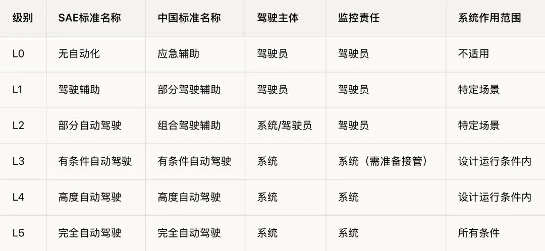 中国的汽车驾驶自动化分级标准充分借鉴了SAE J3016的框架,但根据国情进行了优化调整。其主要特点包括: