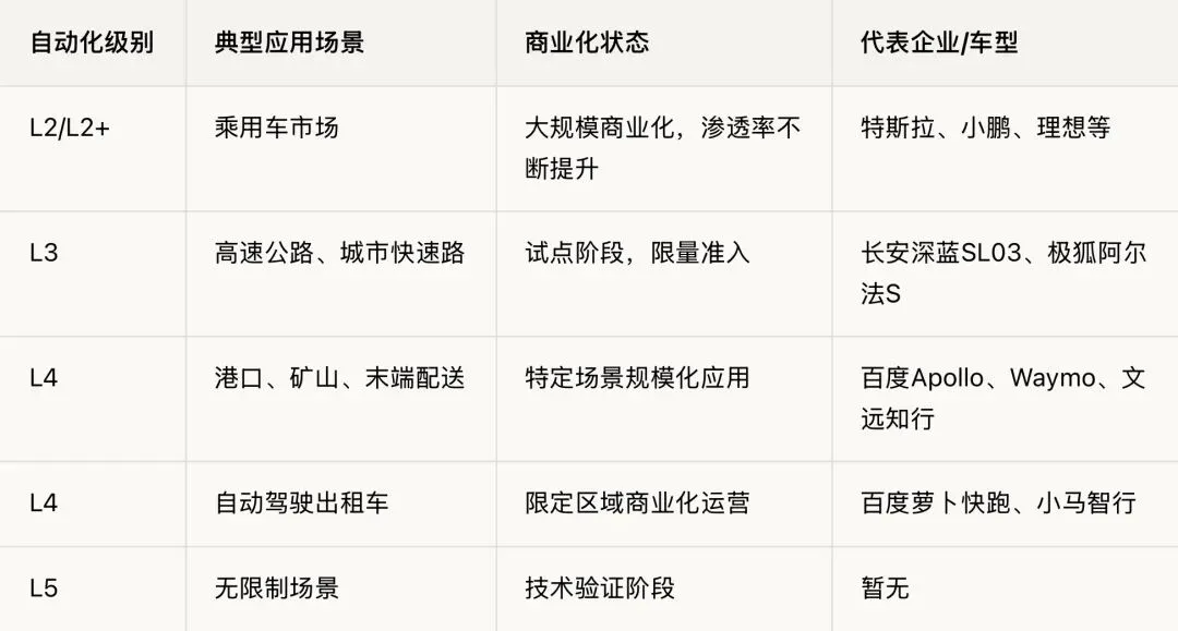 表:不同级别自动驾驶商业化状态对比(截至2025年)