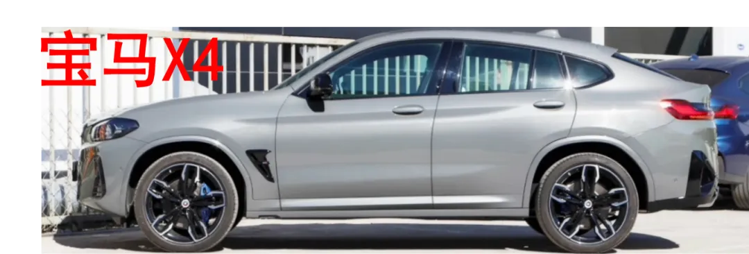 首先是燃油代表宝马X4。宝马做轿跑SUV可是信手拈来,长车头、短前悬、长L113,车头很霸气。车身视觉重心靠后,整体姿态很运动,腰线有立体感,车尾不翘,侧顶溜背曲线一气呵成。对于一台轿跑SUV来说,这个侧面非常漂亮。