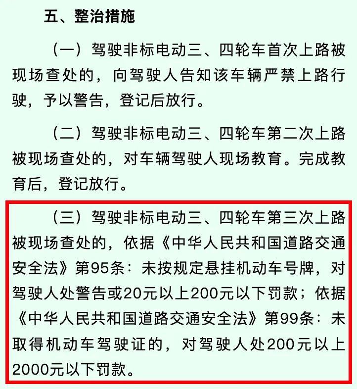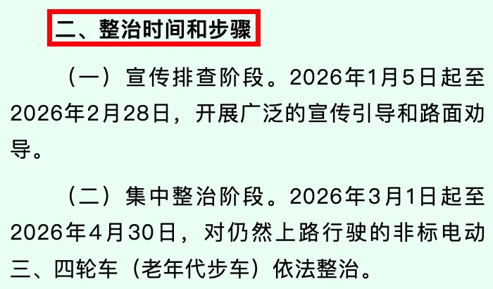 根据当地通告要求,2026年1月5日至2月28日期间为宣传排查阶段,将开展宣传引导和路面劝导工作。从2026年3月1日开始至4月30日期间,对于仍在路面上行驶的非标电动三四轮车将依法进行整治,第一次将被警告、第二次登记后放行、第三次将按未悬挂机动车号牌和无证驾驶,分别处以20-200元、200-2000元罚款。