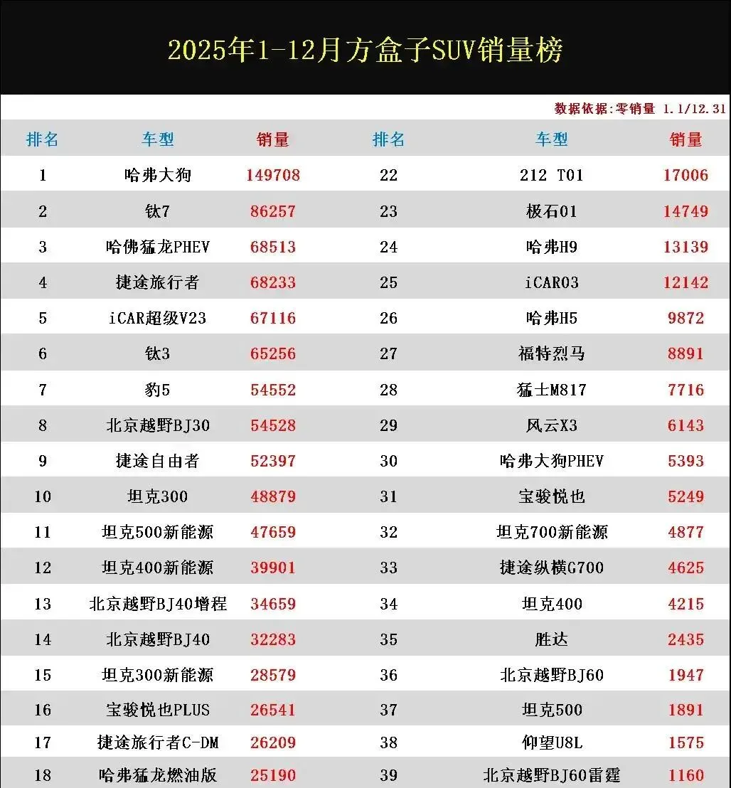 2025年,方盒子SUV销量杀疯了!弗大狗14.9万辆霸榜,合资车集体哑火——这数据,我直接笑出眼泪。