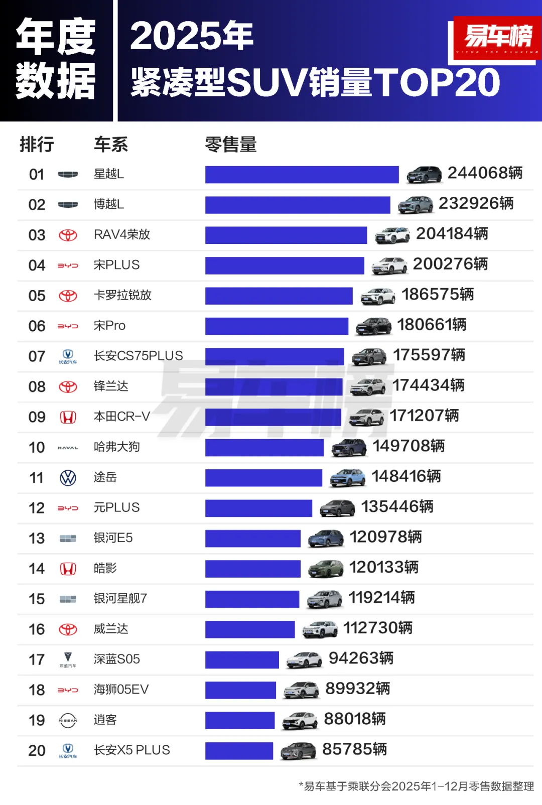 紧凑型SUV销量前3名分别为:星越L、博越L、RAV4荣放;销量分别为:244068辆、232926辆、204184辆