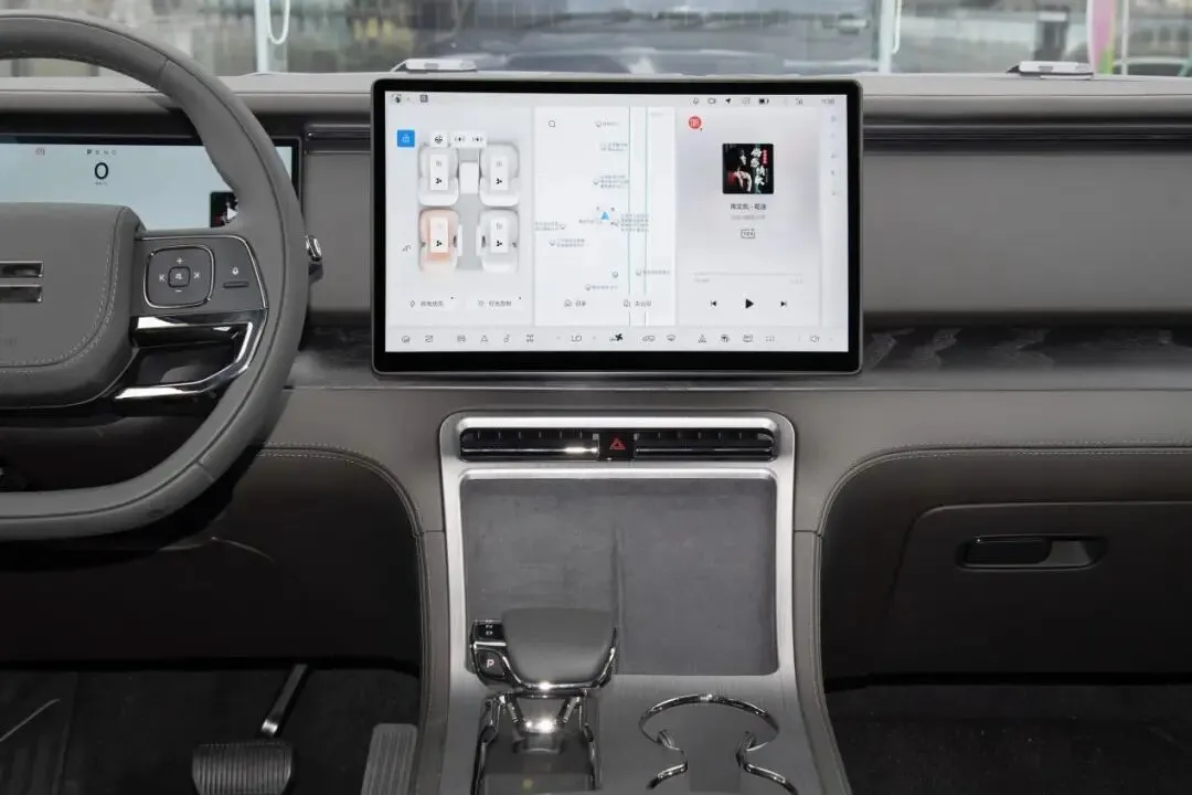 内饰也给得很大方,极石01用了大面积Nappa真皮包裹,也有木纹饰板点缀,256色氛围灯和14扬声器,豪华感很强,五屏互联、15.7英寸3K中控屏,还有25.6英寸吸顶屏,真的是高科技设计了。