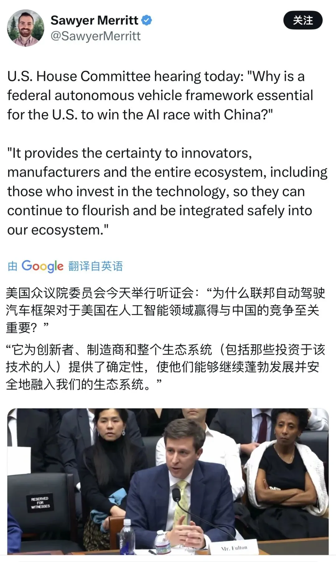此次会议的核心突破点,在于新的豁免条款。根据现行联邦法规,制造商每年最多只能部署2500辆不符合传统《联邦机动车安全标准》(FMVSS)的车辆,例如没有方向盘或踏板的汽车。对于“Cybercab”这样旨在大规模量产和普及的车型,这一限制无异于扼住了其咽喉。新提出的《自动驾驶法案》草案计划大幅提高这一上限。据悉,讨论中的目标数字是每家制造商每年9万辆,并将在随后几年逐步提升至10万辆。这一变化,将成为推动自动驾驶走向普及的关键引擎。对特斯拉而言,此次听证会的另一大胜利,是委员会在“联邦优先权”问题上立场坚定。该条款意味着,只要车辆符合联邦安全标准,各州或各城市便无权禁止其上路。这直接回应了一些州和地方立法机构试图设置地方性禁令和许可标准的做法,例如加州车管局和纽约市议会此前提出的相关议案,从而有望结束当前各地法规拼凑不一、阻碍技术全国性部署的局面。是什么促使美国两党在这一议题上迅速达成共识?贯穿听证会的一个关键词是:国际竞争。讨论的焦点已从单纯的“安全与创新之辩”,转向了“如何保持产业竞争力”。议员们普遍流露出一种紧迫感,担心若在自动驾驶立法上停滞不前,将把汽车产业的未来拱手让给正在积极部署 Robotaxi(自动驾驶出租车)的竞争对手。“我们不能让美国落后”,这几乎成了听证会的非官方口号。这一思路的转变至关重要——它使得《自动驾驶法案》不再仅仅是一项交通法规,更被视为关乎国家经济安全和产业领先地位的必须通过的立法。听证会结束后,该法案将进入条文修订阶段,对最终措辞进行打磨,预计将在今年晚些时候提交众议院全体表决。从目前展现的两党支持力度以及对保持竞争力的共同关切来看,其通过的前景比以往任何时候都更为明朗。对于特斯拉和整个自动驾驶行业而言,这意味着引擎可以全速启动了。法规的高墙正在松动,属于“Cybercab”和真正自动驾驶时代的道路,终于开始畅通。