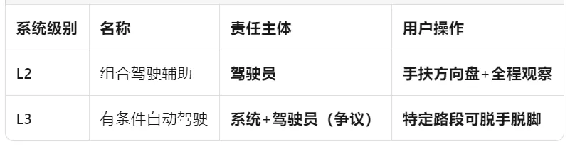 结论:量产车仍是L2,方向盘不能离手,事故责任在驾驶员;L3测试是运营单位行为,用户不能自行“放飞”。