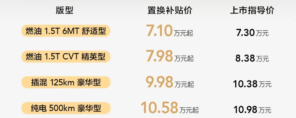 燃油版有2个车型,其中手动挡5.98万元,CVT自动挡7.28万元。不用管那个指导价,它这个置换补贴就是厂家变相给的优惠,人人都能拿。现在买,你还能参加1000抵2000的活动,再省个1000元。