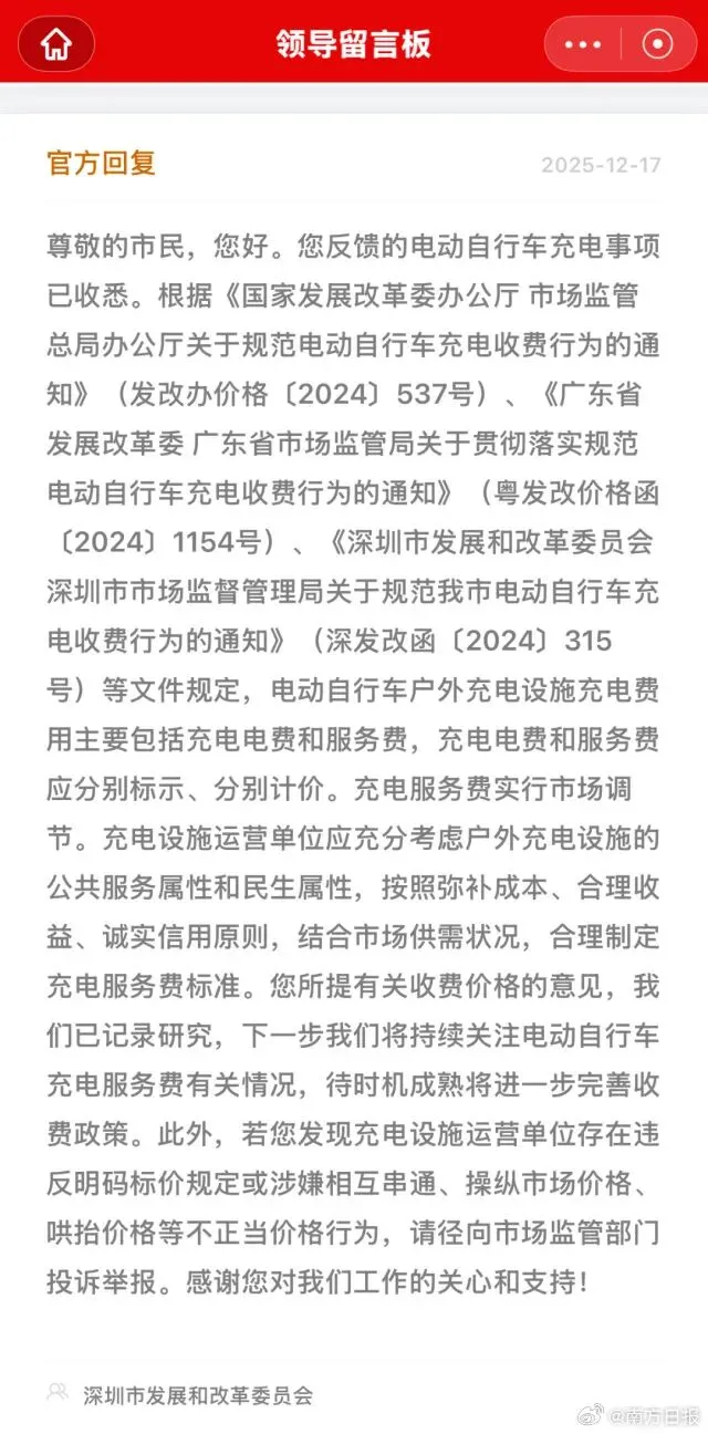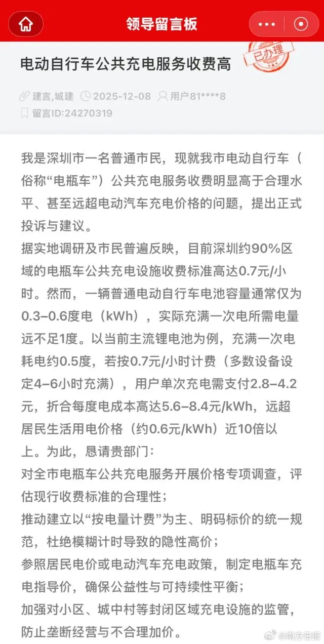 最近,有深圳市民通过人民网“领导留言板”反映,深圳市电动自行车公共充电服务收费明显高于合理水平,甚至远超电动汽车充电价格。对此,深圳市发展和改革委员作出回应,表示将持续关注相关情况并研究完善收费政策。该市民在留言中表示,据实地调研及市民普遍反映,目前深圳约90%区域的电瓶车公共充电设施收费标准高达0.7元/小时。然而,一辆普通电动自行车电池容量通常仅为0.3-0.6度电(kWh),实际充满一次电所需电量远不足1度。以当前主流锂电池为例,充满一次电耗电约0.5度,若按0.7元/小时计费(多数设备设定4-6小时充满),用户单次充电需支付2.8-4.2元,折合每度电成本高达5.6-8.4元/kWh,远超居民生活用电价格(约0.6元/kWh)近10倍。对此,深圳市发展和改革委员会回复称,根据有关文件规定,电动自行车户外充电设施充电费用主要包括充电电费和服务费,充电电费和服务费应分别标示、分别计价,充电服务费实行市场调节。充电设施运营单位应充分考虑户外充电设施的公共服务属性和民生属性,按照弥补成本、合理收益、诚实信用原则,结合市场供需状况,合理制定充电服务费标准。下一步将持续关注电动自行车充电服务费有关情况,待时机成熟将进一步完善收费政策。