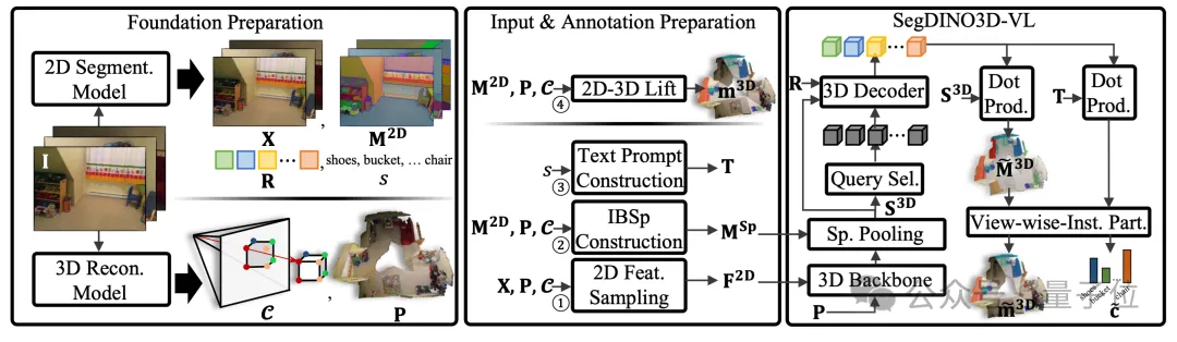 另一条路径送入成熟的2D分割模型,在获得图像级、物体级的特征(作为SegDINO3D特征补充)的同时,也会提供2D实例分割结果,以及对应的各个实例的类别名称。