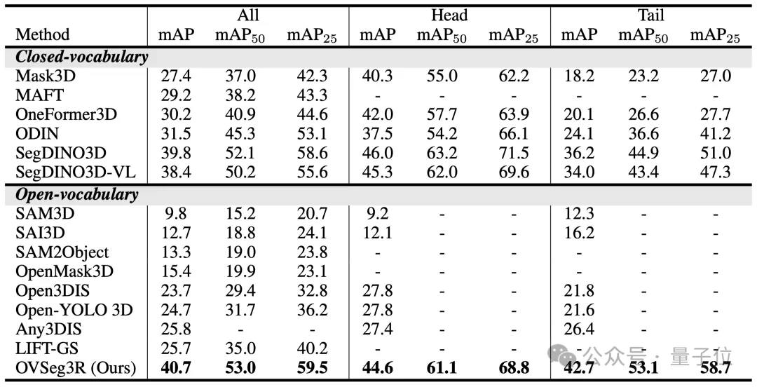 通过上述方案创新,OVSeg3R在极具挑战性的ScanNet200 3D实例分割基准测试中,不仅大幅超越所有现有开集模型,同时刷新了闭集模型的最新记录,将长尾类与头部类的性能差距从11.3 mAP骤缩至1.9 mAP,彻底改善类别性能不均衡问题。