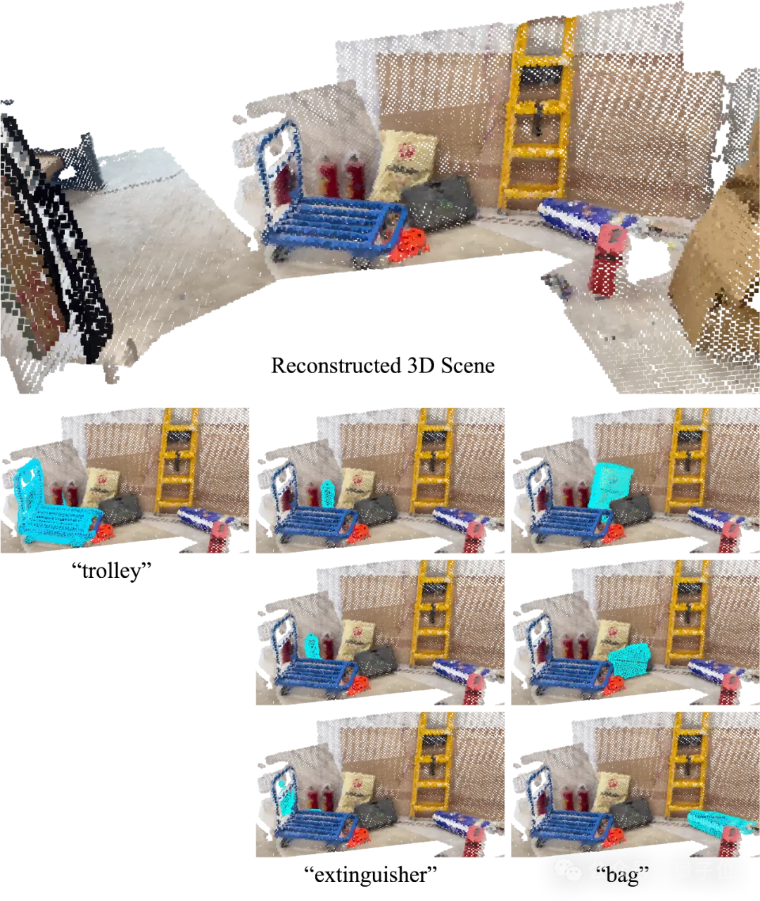 如图6、图7所示,由于几何结构稀疏(比如三脚架)以及细小物体(比如瓶子、鼠标、插排)在充满噪声的点云上进行人工标注的难度很高,因此在现有数据集中,这些类别的缺失十分严重,导致已有算法无法处理这些类别。但OVSeg3R依然能将这些物体稳定地识别并分割出来。