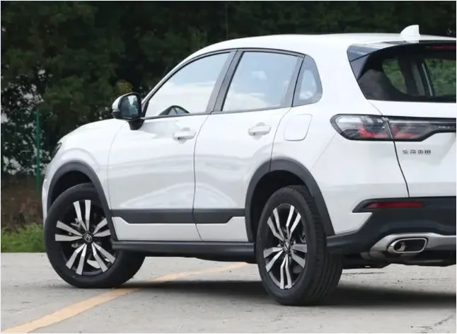 外观方面HR-V的颜值我觉得在同级里算是比较能打的,特别是那个黑白拼色的版本,看着挺时尚也挺年轻化,不会让人觉得很老气。前脸用的蜂窝状中网搭配本田那个标,辨识度确实挺高,开出去也不会让人觉得掉价,毕竟合资身份在那放着。而且细节上它有一根白色饰条贯穿左右大灯,这个设计能让前脸看起来更协调一些,大灯造型比较圆润饱满,自动大灯该有的功能也都给配上了。下包围和三角形的雾灯区域做得还算立体,整个车头虽然尺寸不大但气场还行,那种厚实感和霸气感确实挺适合年轻人开的。