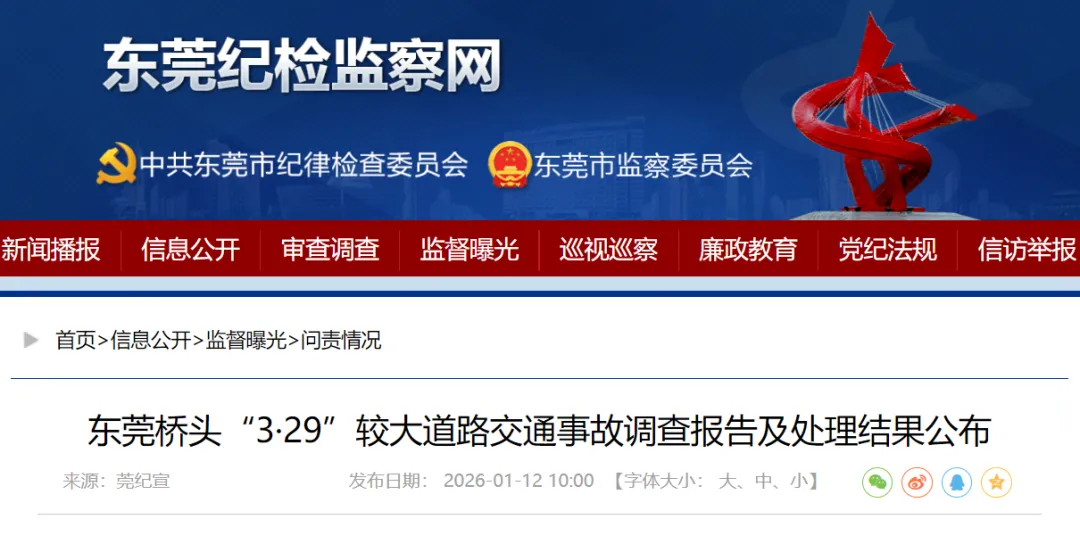 1月12日,东莞纪检监察网发布《东莞桥头“3·29”较大道路交通事故调查报告及处理结果公布》,详情如下: