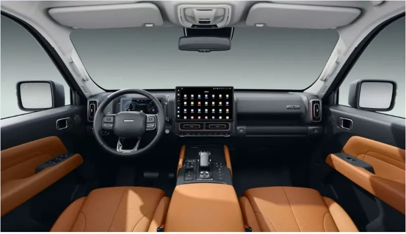 内饰变化不算大,主要是在舒适性和配置上做了升级。有几个设计我觉得挺实用的,副驾保留了扶手,B柱也带扶手,中控扶手做得挺宽大,还保留了经典的电子挡把和部分实体按键,这些都是老司机比较认可的设计。橘色区域用了皮革包裹,中控屏升级到14.6英寸,芯片也换成了高通8155,现在支持四区语音唤醒,还独创了越野导航模式这个功能确实有点意思。座椅做了8层填充,柔软度和包裹性都提升了不少,前排还用了双层夹胶玻璃,静谧性比老款好很多,风噪控制得比较明显。即便是运动模式下发动机噪音也压得挺好,部分车型座椅带按摩通风加热,电动多向调节,电动后视镜这些常用功能都给配上了。