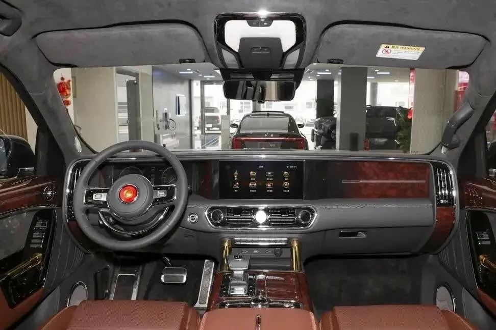 我.先在.外面绕.了一圈,这车第一眼看过去,那个气场真的太夸张了。你从前面看,那种直瀑式中网,大概二.十根镀铬竖条,看着.就像宫殿的.廊柱一.样。我伸手摸了下,是.真金属.的那种.冰凉感,不是那种塑料镀铬糊弄事儿的。引.擎盖上那红旗立标,是.立.体锻造的,阳光.一照有那种雕塑的质感。整车的线条.特.稳重,不浮.夸,但气场拉.满。双.色车身搭22寸密.辐轮毂,再加电动迎宾踏.板——这个仪式感真的有。就是我.个人觉得啊,那个侧面镀铬有点多了点,稍.微有.点花,少一点会更高级。