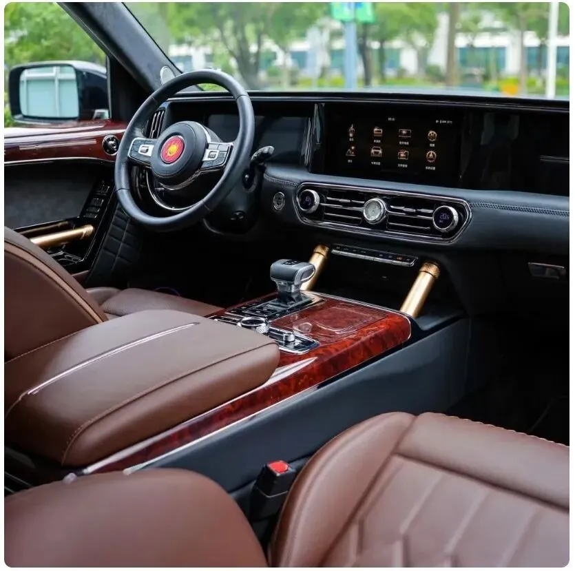 坐进车内啊,这.感觉就不叫SUV了,更像个.移动行.宫。我摸方向盘的那一瞬.间,整个.中控都是那种桦木雕刻,真木.头不是贴膜那种。然后座椅这个牛皮.的味道很舒.服,内蒙古.牧场的小牛皮,软度正好,不.糟不滑。顶.棚是麂皮的,视觉上特温柔,坐进去有点.像.被包进一.个安静的沙发房。就是.我敲了一下门板.下沿,那边用料稍微硬了一点点,细节要是.再.抠下就完美了。