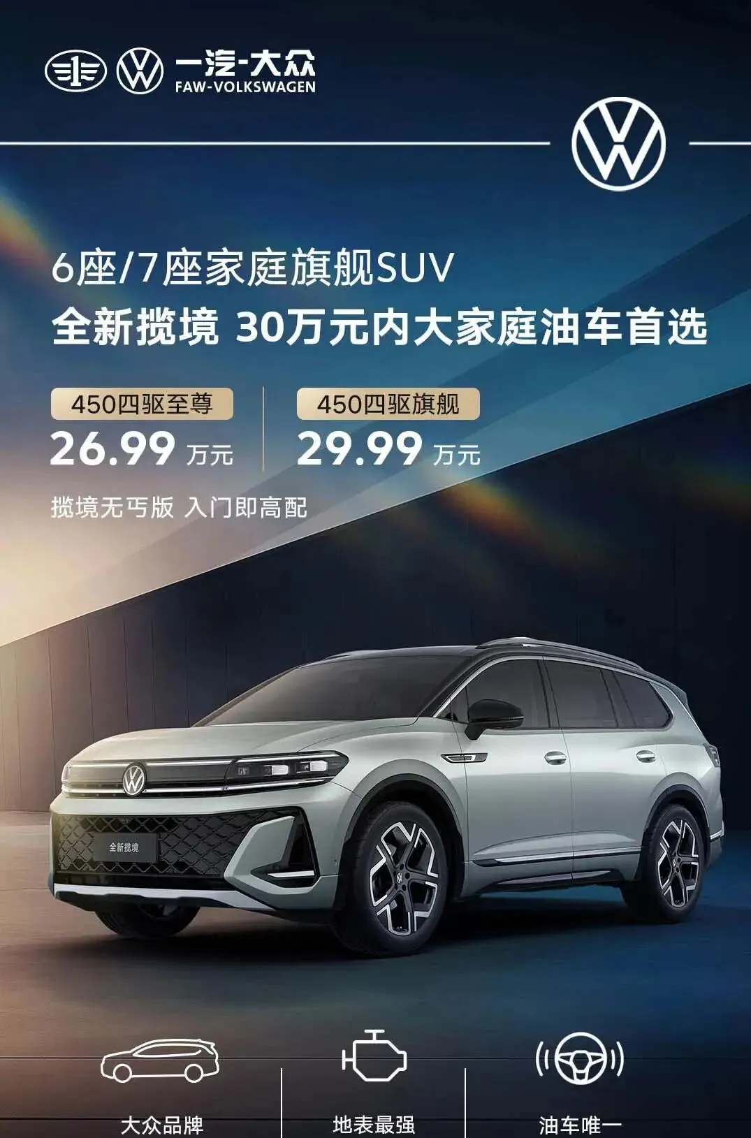 看完这车我脑袋咯噔一下,2.2米纯平大空间,起步26.99万,还真不是啥新能源,是正儿八经的燃油大SUV。这年头,谁还敢这么刚?讲真,第一眼看到这车我还以为是啥百万级的进口大块头。车身5168mm长,2002mm宽,近1米8高,比我记忆里隔壁老王那台X5还唬人。关键人家不是走高端那套弯弯绕,而是实打实地六座、七座随你选,后备箱照样能装四个行李箱,这个尺寸,回老家一车人外加年货不在话下。你说六座七座这事儿吧,听着耳熟,真用的时候就知道差距了。全新揽境的第二排还给安排了按摩、加热、通风、电动调节,就问你坐后排的爸妈满意不满意?第三排坐人还能装行李,真不是“摆设”,这对多孩家庭太友好了。最让我愣住的是它这套动力。什么第五代EA888 2.0T发动机,最大功率200kW、400N·m扭矩,不说参数了,就一句话:起步不肉,高速不虚,7.5秒破百,关键是百公里油耗才8.3L,对比家里那台11个油起步的老SUV,这表现,省下的钱都能贴孩子一学期学费了。再说智能化这块,揽境也是整挺好。啥三块屏幕啊,啥语音助手能听方言、能一句顶一堆指令,还有副驾娱乐屏——副驾说想看点啥都不用我操心。更夸张的是,那套啥IQ.Pilot增强系统,能帮你自动变道、自动泊车,城市开车再也不用死磕那一点停车位,新手也不慌。面子这块也得讲讲。你想啊,30万以内,你拉着一家人出门,一亮那大众标+大车身,别人第一反应都以为你至少花了小五十万。这不比啥花里胡哨的车更管用?你说没点品牌情怀谁信?隔壁表哥前段时间刚换了台合资MPV,落地三十多万,开起来还挺肉,空间大是大,就是那油耗和加速让我打死都不眼红。现在一看揽境这配置、这动力、这空间,咱实在人也得说句——值!当然,厂家这么搞我也理解。新能源这么卷,纯燃油车得给点狠料才有活路。一汽-大众能端出这盘菜,估计是豁出去了,要销量,也要口碑,毕竟现在的用户太难伺候,光便宜不行,光智能也不行,得都占着才行。不过话说回来,这种大块头车不是谁家都合适。家里就俩人开开买菜用,真没必要上这规格;但你要是经常全家出行,还得跑长途,有老人有娃,那这车可能真是答案。终身质保+基础保养全免听着就爽,加上置换补贴、零首付啥的,感觉厂家也知道大家最近都紧巴巴地过日子,能省点是点。说白了,咱普通人买车图个啥?能装、能跑、省油、有面子、不糟心。这车吧,目前看是都对上了。