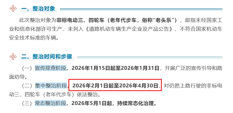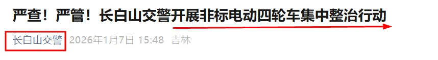 此外,吉林长白山也发布通告。自2026年1月1日起,长白山交警将开展非标电动四轮车(老年代步车)整治,严查无证驾驶、未悬挂号牌上路行驶的违法行为。