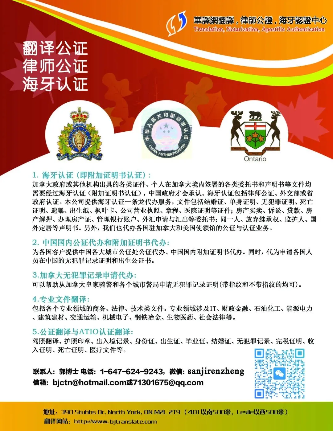 从2024年1月11日开始我们代办海牙认证(国内也称为附加证明书认证)业务,周期1-3天左右,覆盖加拿大和美国全境。在律师公证和海牙认证(相当于以前的领事馆认证的前两级)方面拥有十多年丰富经验,已经为数千名海外华人成功办理海牙认证,包括出生证、结婚证、无犯罪证明和公司注册文件等加拿大政府签发的上百种证件,售房委托书、诉讼委托书、同一人声明书、遗产放弃声明书等上百种个人签署的文件。另外提供各类移民文件的公证/认证翻译服务,签证/续卡/入籍等相关服务。提供中国境内公证处出具的中英文出生公证和无犯罪证明公证书代办服务,用于世界各地。欢迎惠顾!