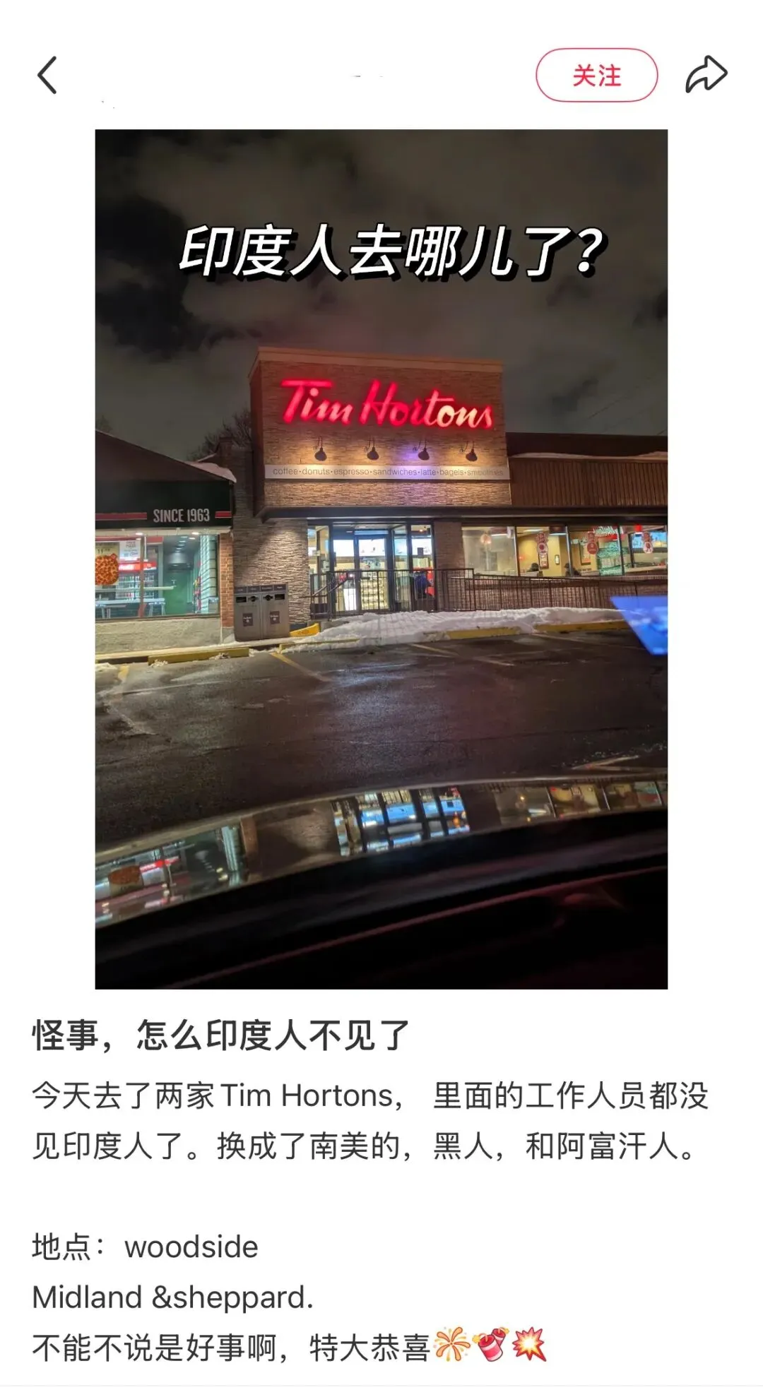 楼主的观察精准戳中了多伦多打工人的共同记忆:“今天去了两家 Tim Hortons,里面的工作人员都没见印度人了。换成了南美的,黑人,和阿富汗人。”