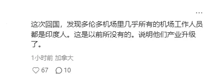 有网友直接给出了进阶版答案:“这次回国,发现多伦多机场里几乎所有的机场工作人员都是印度人。这是以前所没有的。说明他们产业升级了。”