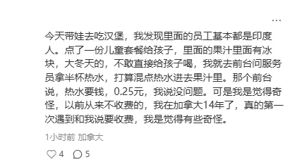 也有人分享了自己的糟心经历:“今天带娃去吃汉堡,我发现里面的员工基本都是印度人。点了儿童套餐,果汁里有冰块,大冬天不敢给孩子喝,去前台要半杯热水混一下,结果服务员说热水要钱,0.25 元。我在加拿大 14 年了,真的第一次遇到。”