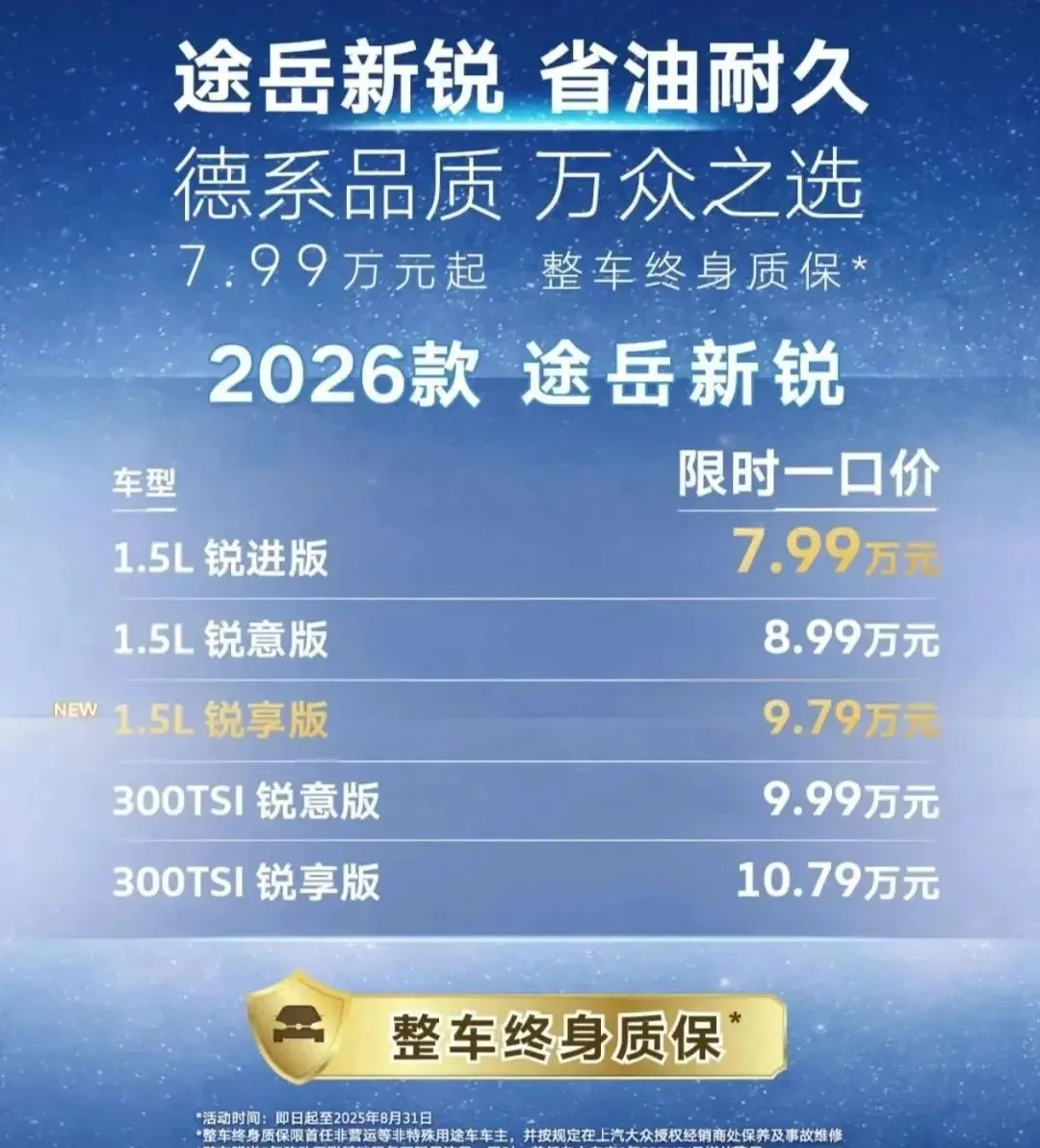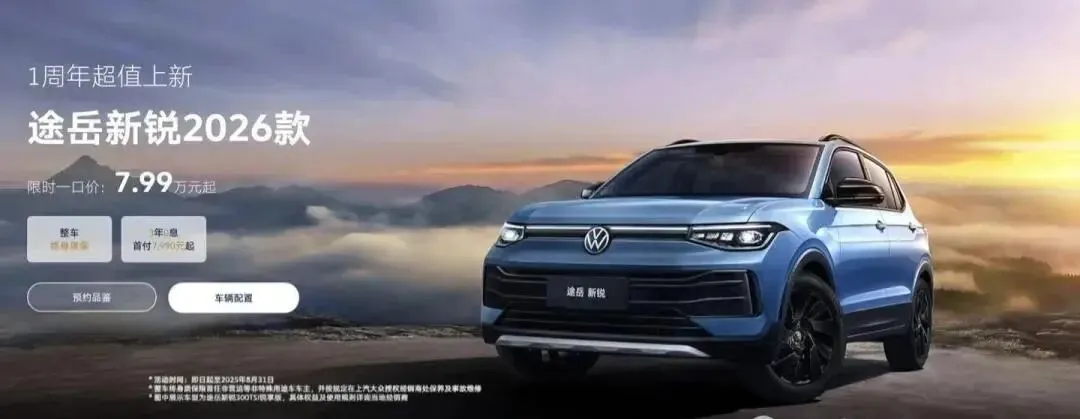 蓝色途岳新锐停在山路旁,前脸线条看着更精神。价格一出来,等等党多少有点坐不住:上汽大众把2026款途岳新锐的限时起售价做到了7.99万元。不到8万拿下一台带德系血统的SUV,还配上整车终身质保,这种组合在合资阵营里确实少见。很多人第一反应就是——这是不是哪儿写错了。