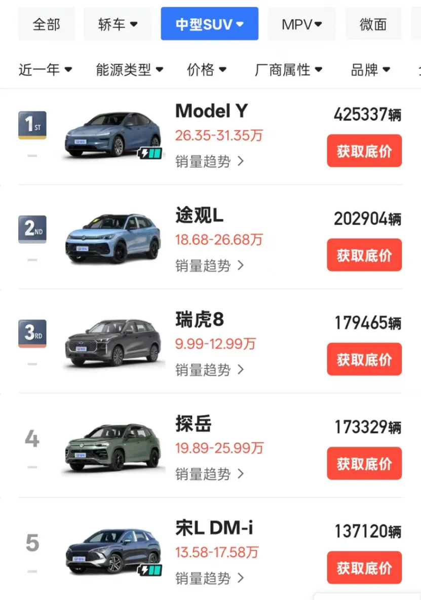 和2024年一样,去年中型SUV市场的冠军车型依然是特斯拉Model Y,排在后面的途观L、探岳、瑞虎8等车型依然位居2-4名,只是排名有了细微变化。中型SUV市场的格局依然相对稳固。
