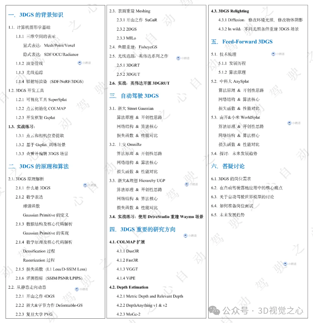 为此自动驾驶之心联合工业界算法专家开展了这门《3DGS理论与算法实战教程》!我们花了两个月的时间设计了一套3DGS的学习路线图,从原理到实战细致展开。全面吃透3DGS技术栈。