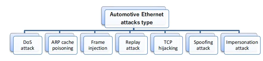这一问题可以通过实施新的加密和认证方法及相关技术来解决。然而,在TSN系统中还必须考虑其他因素,包括带宽和配置;安全加密可能会改变带宽需求,并且作为TSN流配置的一部分,也应将安全考虑因素纳入其中。从网络架构来看,拒绝服务(DoS)攻击仍然是需要重点关注的最大潜在威胁。如图5所示,汽车以太网攻击可分为以下几类:拒绝服务(DoS)攻击、帧注入攻击、重放攻击、欺骗攻击、伪装攻击、ARP缓存中毒攻击和TCP劫持攻击。检测这些恶意行为的一种可行方法是实施入侵检测系统(IDSs),未来这可能会成为全球范围内的强制性规定。然而,完全加密虽然能够确保消息的真实性并防止窃听,但会消耗大量资源,并导致较大的延迟。
