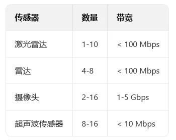 短期内实现每秒数千兆比特的数据传输,长期目标是实现更高的传输速率(超过100G),包括新的创新和扩展,如时间关键型数据传输机制。此外,还必须满足严格的时序要求:低延迟、同步性和无明显抖动。表1总结了预计将集成到自动驾驶汽车中的传感器数量和类型及其带宽要求。