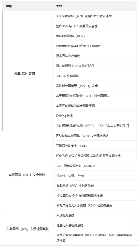 在本文中,综述了许多关于 TSN 安全性的研究,这些研究旨在增强协议、算法和加密机制,以确保车载网络(IVN)的安全性,同时也涉及架构和整合问题。表2总结了车载网络(IVN)领域的研究论文及其主题。车载网络(IVN)领域分为以下几类:汽车TSN要求、车载网络(IVN)安全协议和车载网络(IVN)入侵检测系统。