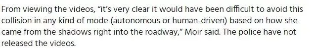 警方也说明,伊莱恩是在非人行横道横穿马路,然后又表示看过 Uber 的行车记录仪,伊莱恩从暗处突然出现,如果是人来开车,也不可避免的会撞到她。