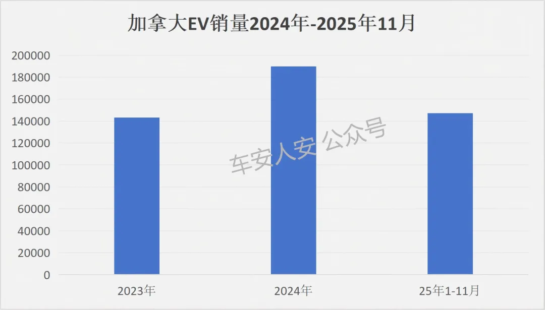 1月16日,法新社、纽约时报等多家外媒报道称,加拿大将允许每年最多4.9万辆中国电动车以6.1%的最惠国关税进入,到第五年,中国电动车进口配额将提升到7万辆,其中进口中国电动车数量中,超过50%将是进口价低于3.5万加元(约合17.6万人民币)的低价车型。本文解决一个问题:加拿大对中国EV车型的进口配额,短期内是哪些中国的汽车品牌受益?加拿大为左舵车,执行美标标准,最近三年销量如下图:加拿大市场EV零售量2023-2025年11月大约都在14-18万辆。EV销售前五名品牌分别是:特斯拉、通用、现代、福特、大众。2023年出口3.8万,2024年出口2.4万,2025年1-11月只有19辆。因为2024年10月以后,加拿大对中国EV车型在6.1%最惠国税率基础上,加征了100%关税,中国电动汽车出口加拿大的关税达到了106.1%,因此,2025年中国EV出口加拿大几乎为0。但是,中国EV车型出口加拿大的品牌严重集中,大约80%-90%的出口量是特斯拉,剩下第二第三名是极星、奔驰smart。因此,2026年短期之内,加拿大对中国的EV进口配额,最大的受益者只有特斯拉!因为吉利、比亚迪、奇瑞也有向加拿大销售过EV车型,加紧做相关认证的话,2026年下半年以后,这几个品牌的低价EV车型也会有一定销量。因为要求50%销量是低于17.6万元人民币的低价EV车型,2027年以后,其他中国汽车品牌的EV车型会较好的销量表现。