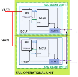 对于 ASIL-D 等级或要求 “故障后持续运行” 的系统,单芯片锁步机制不够用,需引入双 MCU 或主从 ECU 架构:
