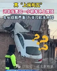 1月16号,张家口阳原县城一辆白色小车冲上民房屋顶,车头插入斜顶呈直立姿态,现场警察正在勘察。随后吊车到场将车取下,车头损毁严重且气囊弹出,所幸司机无大碍。现场车牌被布遮挡,网友纷纷调侃,有的称这是“科目八,上房揭瓦”,有的疑惑是跑道短还是起飞晚,还有网友好奇啥车有“飞行模式”。来源:都市现场