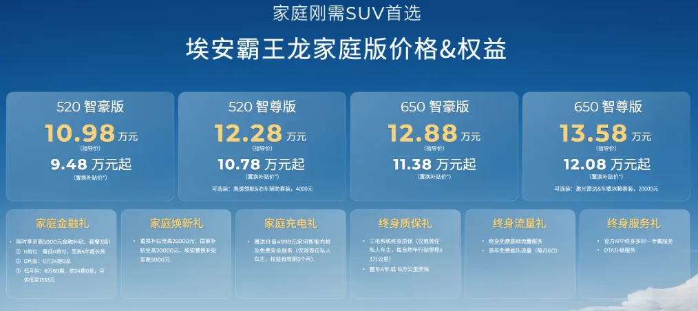关于动力系统以及底盘,厂家也非常听劝。从配置层面来看,这款AION V霸王龙的纯电续航里程为520-650km可供选择,续航表现不错。更关键的是,悬架也进行了升级,采用了前麦弗逊独立悬架以及后五连杆的独立悬架系统。要知道25款AION V霸王龙采用的还是扭力梁非独立悬架系统,所以说26款的舒适性更好,稳定性自然也更加出色了,而且价格还较为实惠。