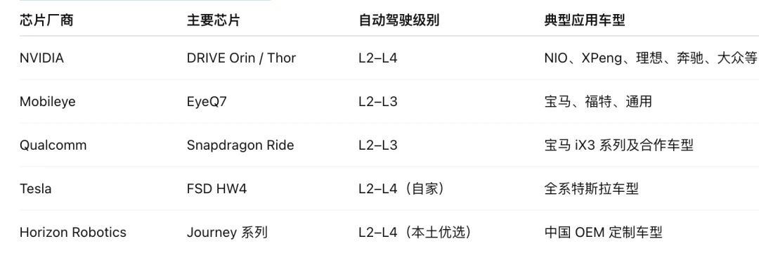 在 AI 驱动下,自动驾驶芯片正从单纯算力元件演化为融合感知、决策与控制的智能平台。这一市场既有英伟达、Mobileye、Qualcomm 这样的全球级玩家,也有特斯拉等 OEM 自研芯片崭露头角,还有中国本土供应商在特定市场快速增长。整体市场格局展现出多方竞争与快速创新并存的态势,并随着自动驾驶渗透率提升而不断重构。