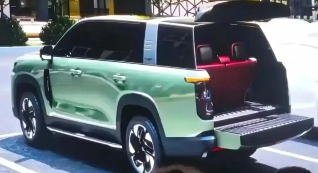 车尾部分玩得更花,采用了上下对开的"天地门"设计,后保险杠还集成了脚踏板,这些细节跟之前官方放出的效果图完全一致。尾部还能看到排气装置,说明这车要么是纯燃油,要么就是混动系统,反正不是纯电那一套。