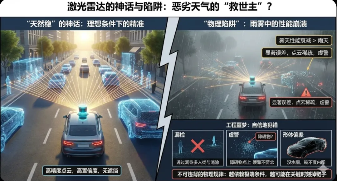 很多人把激光雷达(LiDAR)当作恶劣天气的“救世主”,觉得它能解决相机看不清的问题。但根据公开的研究建模和实测,这种“天然稳”其实是一种错觉。
