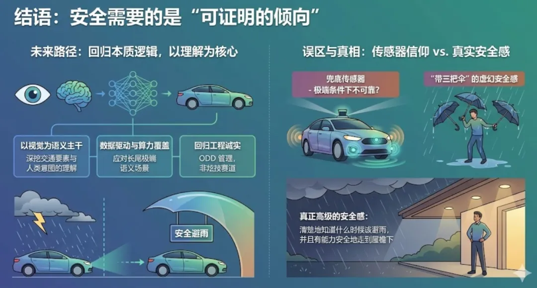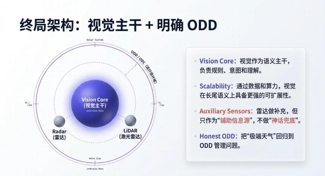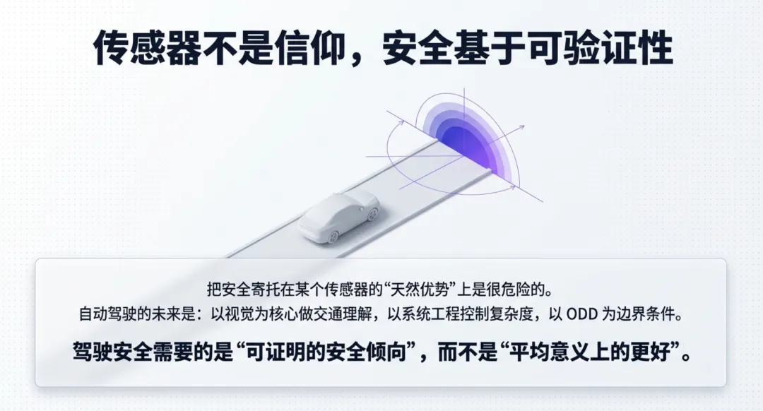 如果所谓的“兜底传感器”本身在极端条件下也会变得不可靠,那么它就很难承担起安全性叙事的主角。 我所主张的未来路径,是回归到更本质的逻辑: