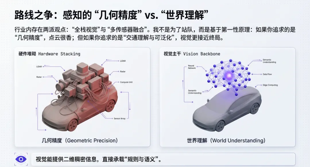 我想借这篇文章把这个逻辑彻底讲透。我并不排斥雷达,但我整体不看好那种“以雷达为核心、以堆硬件换安全”的长期路径。在我看来,视觉路线的上限,才是自动驾驶真正的终局。