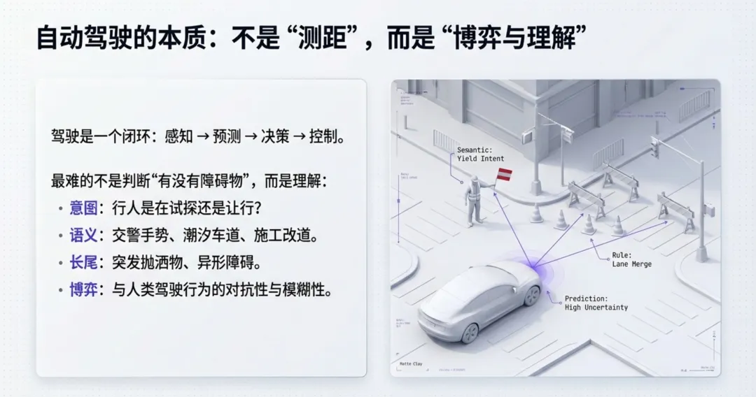 现在很多厂商宣传自己能看几百米,但这只是感知层面的“几何精度”。自动驾驶真正的瓶颈不在于测距,而在于“理解世界”。, 比如前车一个微小的试探性变道意图、施工路段交警的一个模糊手势、或者是潮汐车道上的博弈。