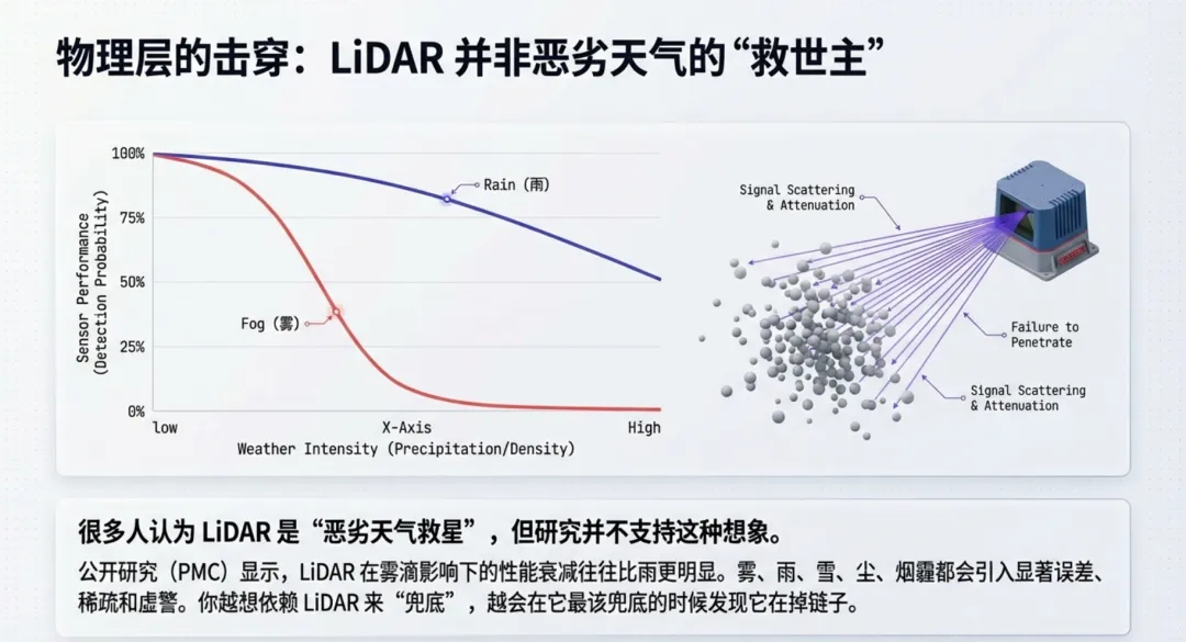 首先,物理规律是不可违背的。 研究显示,LiDAR 在雾天里的性能衰减甚至比雨天更明显,点云层面会出现显著的误差、稀疏甚至虚警。 这种大气条件引起的不确定性,意味着你越想依赖 LiDAR 在极端天气下“兜底”,它越可能在关键时刻掉链子。