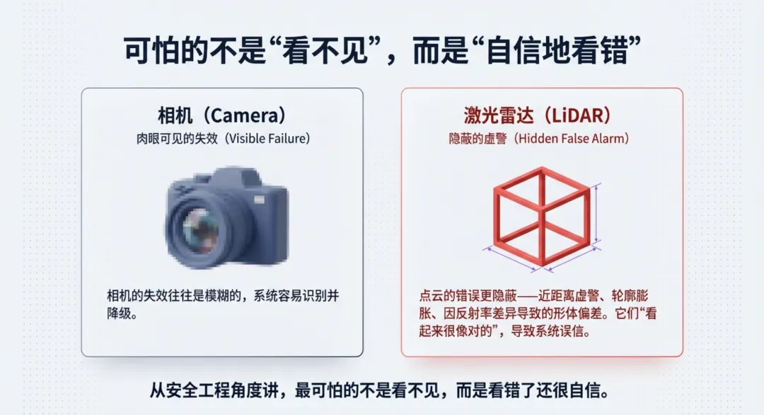 其次,工程上最怕的不是“看不见”,而是“看错了还很自信”。LiDAR 依然会犯错,而且错得更隐蔽:远距离稀疏会导致小目标漏检;雨雾散射会引起近距离虚警或物体轮廓膨胀;甚至不同材质的反射率(比如湿滑路面或黑色车身)都会造成形体偏差。, 这些错误不像相机模糊那样肉眼可见,它们看起来“很像对的”,这最容易误导决策系统做出致命选择。